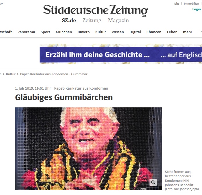 Niki John­son fühl­te sich auch „total ange­spornt, etwas zu tun und eine Dis­kus­si­on anzu­zet­teln“. Zugun­sten des Kon­doms und um Papst und Kir­che anzu­f­ein­den, wie zu ergän­zen ist. „Wir müs­sen auf Welt­füh­rer Druck machen, die sich gegen Gesund­heits­för­de­rung und sexu­el­le Auf­klä­rung stel­len.“ Das tat die Künst­le­rin durch ihr kon­dom­ge­knüpf­tes Bild, das von vor­ne wie der Papst aus­schaut und von hin­ten … wie Kon­do­me eben. Zivil­cou­ra­ge brauch­te sie dazu jeden­falls keine.