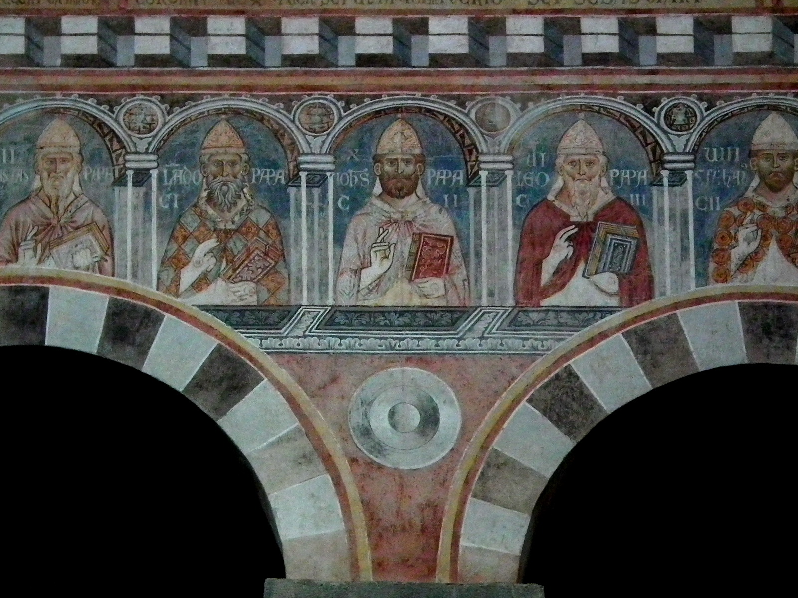 Das umfangreiche Werk besteht aus drei übereinanderliegenden Bildreihen und wurde vor kurzem restauriert. In der untersten Reihe finden sich die Porträts aller Päpste des ersten christlichen Jahrtausends, vom Apostel Petrus bis zu Johannes XVII., der im Jahr 1003 regierte. Papstporträts finden sich auch in der Patriarchalbasilika St. Paul vor den Mauern in Rom mit dem Unterschied, daß jene von San Piero a Grado älter sind.