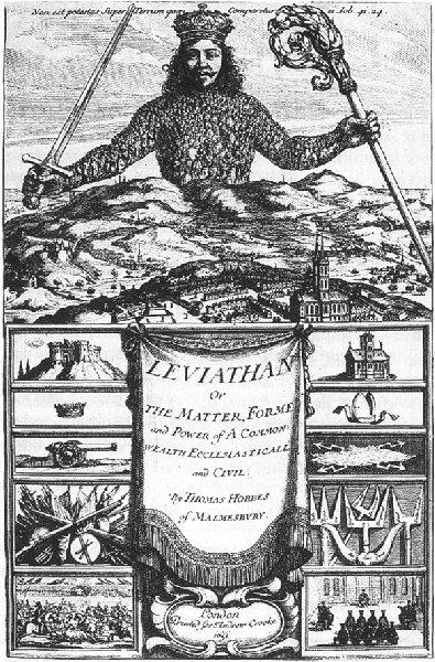 Hobbes‘ Leviathan war der Schulterschluss einer Gemeinschaft in Lebensgefahr. Das Titelblatt der Erstausgabe (1651) zeigt den gewaltigen Herrscher einer eng verflochtenen Gemeinschaft mit Krone, Schwert und Bischofsstab. Am oberen Rand ist die erste Hälfte des lateinischen Zitats aus der Bibel zu entziffern: „Non est potestas super terram quae comparetur ei. Es gibt nicht seinesgleichen auf der Erde“ – wenn man das Zitat in der Bibel zu Ende liest, dann wird des Rätsels Lösung einsichtig: „dazu geschaffen, ohne Furcht zu sein.“ (Hiob 41,25)