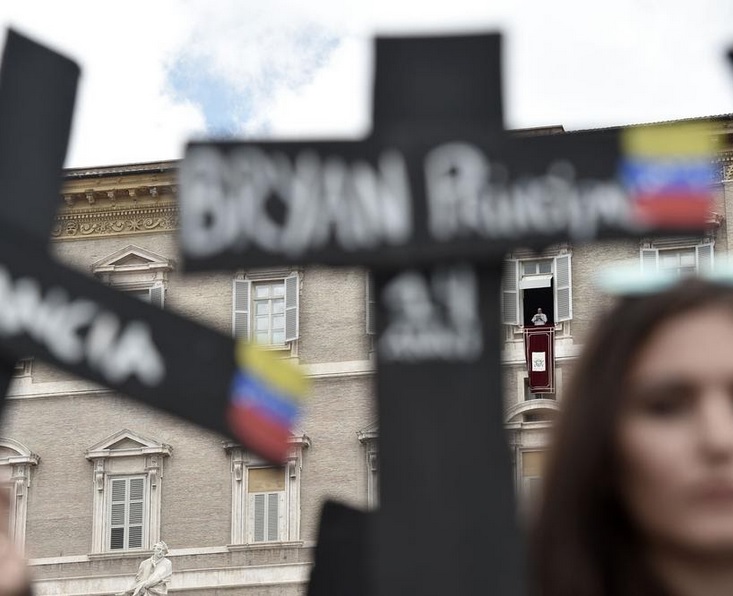 Auf dem Petersplatz machten gestern beim Regina Coeli venezolanische Gläubige mit schwarzen Kreuze auf die Unterdrückung in Venezuela aufmerksam. Mit weißer Farbe standen auf den schwarzen Kreuzen die Namen der Toten geschrieben, die bei den jüngsten Protesten gegen das sozialistische Regime von Nicolas Maduro erschossen oder erschlagen wurden.