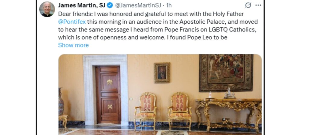Und wo Sr. Caram ist, da ist auch P. James Martin SJ nicht weit – der bekannteste Homo-Aktivist im ClergyMan. Heute früh wurde er von Leo XIV. empfangen. Wie stets, wenn der US-Jesuit spricht, ging es offenbar auch diesmal ausschließlich um das eine Thema. Auf X (vormals Twitter) ließ P. Martin verlauten: