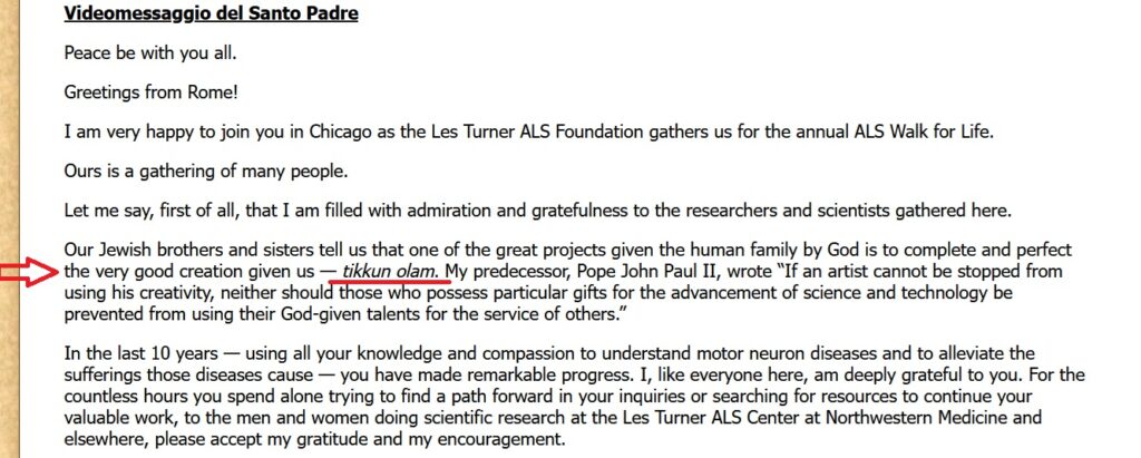 Bis zu diesem Punkt bewegen wir uns im bekannten und längst vertrauten Muster, das sich seit der Revolution des Zweiten Vatikanischen Konzils herausgebildet hat. Doch es gibt ein weiteres Element, das der besonderen Beachtung bedarf: nämlich das Konzept des „Tikkun olam“.