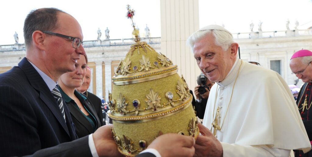 Der lateinische Westen hingegen verzichtete im 20. Jahrhundert auf zahlreiche Formen, die einst die Würde und die Identität des Petrusdienstes sichtbar machten. Offiziell abgeschafft wurde die päpstliche Tiara allerdings nie. Paul VI. setzte sie demonstrativ ab und legte sie auf den Altar. Sie wird seither lediglich nicht mehr getragen. Im persönlichen Wappen der Päpste blieb sie bis Benedikt XVI. präsent, im allgemeinen Papstwappen ist sie es bis heute. Es handelt sich also um ein Symbol, das weiterlebt, obwohl es in den Pontifikaten seit 60 Jahren nicht mehr erscheint. Der zeitliche Rahmen fällt dabei genau mit der Zeit zusammen, die für die katholische Kirche durch eine starke innere und äußere Krise gezeichnet ist. Mit Bezug auf die Symbolik sehen manche in der Niederlegung der Tiara den Beginn der Kirchenkrise.