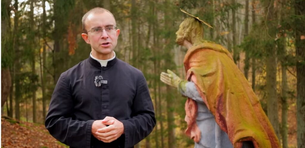 Pater Jakub Zent­ner, Pfar­rer des Mari­en­wall­fahrts­or­tes Řimau, auf dem Pas­si­ons­weg bei der Sta­tue von Jesus Chri­stus im Ölberg