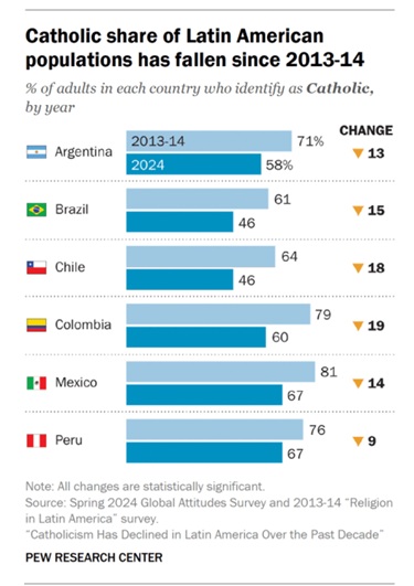 Noch 2013/​14 ver­füg­ten alle sechs Län­der über kla­re katho­li­sche Mehr­hei­ten von rund 60 Pro­zent oder mehr. Heu­te ist die­se Mehr­heit in Bra­si­li­en und Chi­le auf etwa die Hälf­te der Bevöl­ke­rung geschrumpft. In Mexi­ko und Peru sind es noch etwa zwei Drit­tel, in Argen­ti­ni­en und Kolum­bi­en rund 60 Pro­zent – über­all deut­lich weni­ger als früher.