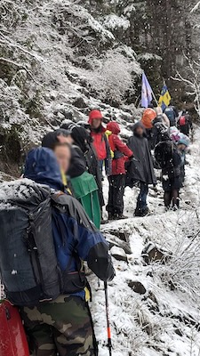 Unter den Pilgern, die die 900 Höhenmeter im Schnee bewältigten, befanden sich Teilnehmer aus verschiedenen Regionen, darunter mehrere Pfadfinder. „Wir sind durchnäßt und frieren, aber wir haben es geschafft – für La Salette.“ Viele kamen auch aus der näheren Umgebung: La Salette zieht an. Und man muß anerkennen, daß die Botschaften des Heiligtums gut in unsere bewegte Zeit passen.