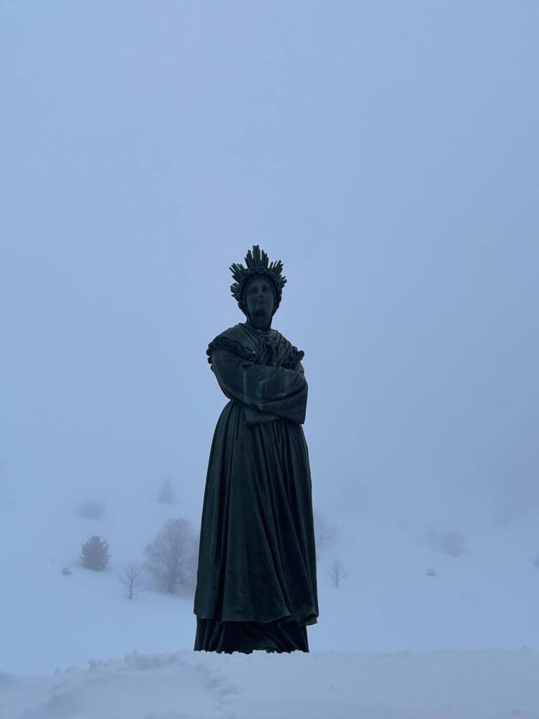 Nachdem sich die Pilgerschar durch den Schnee bis zum Heiligtum gekämpft hatten, konnte sie dort um 12:30 Uhr an der eucharistischen Anbetung teilnehmen – in sehr stiller und gesammelter Atmosphäre, gemeinsam mit den beiden Priestern, die sie auf dem Weg begleitet hatten. Stille lag über dem Land. Das bekannte Marienheiligtum liegt auf fast 1800 Metern Höhe, umgeben von Bergen und eingebettet in Almmatten, die nun unter einer dicken Schneedecke lagen.